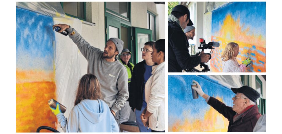 Die Altersspanne der kleinen und großen Aktiven, die sich an der Schwimmbadwand unter Anleitung des Künstlers betätigten, reichte von neun Jahren bis zum 92-jährigen Rudi Haas, der es sich nicht nehmen ließ, selbst zur Spraydose zu greifen.