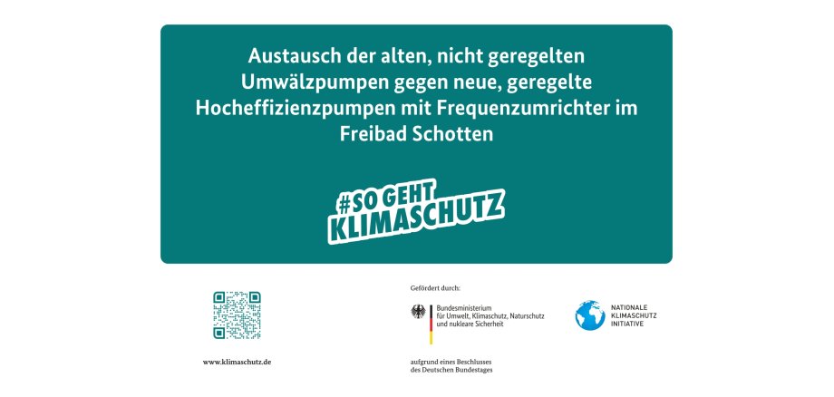 Die Stadt Schotten wird für die nächste Badesaison die alten Umwälzpumpen im Freibad durch energieeffiziente Umwälzpumpen austauschen. Durch diese Maßnahme sparen wir ca. 31 % Strom/a ein und verringern den CO²-Ausstoß um ca. 676 Tonnen über die gesamte Lebensdauer der Anlage.